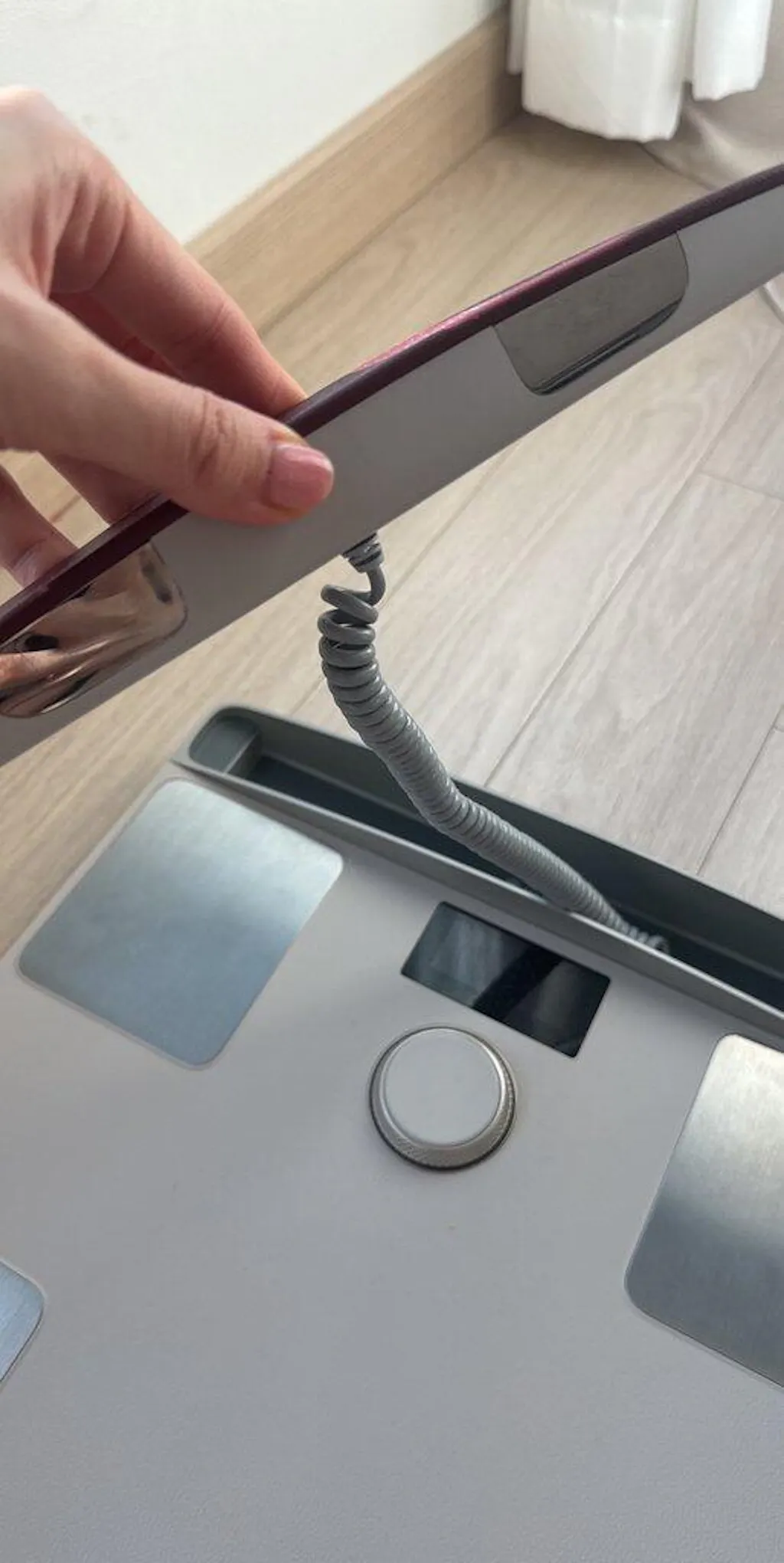 It’s also very easy to use. As the name suggests, you just turn the dial to input your height and step on. The tactile feel of the dial is surprisingly nice. You align your heels, hold the handles, and place your thumbs, and the measurement finishes quickly, perfect for busy mornings.